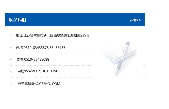 地址:常州市新北區友邦商務大廈1幢16、17層  電話:0519-85101652  傳真:0519-85112595  郵編:213022  網址:www_cz-jiayue_cn.njjtds.com  郵箱:xiajifengaa@163.com